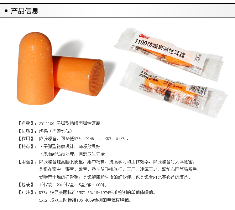 降噪值(NRR:29dB/SNR:31dB)较高,降噪效果良好;产品材质柔软,佩戴舒适并适合长时间佩戴;子弹头轮廓设计,便于使用者佩戴;表面光滑并经防污处理,使用更卫生。本产品是一款免保养型耳塞,当耳塞脏污、破损后,应及时更换。