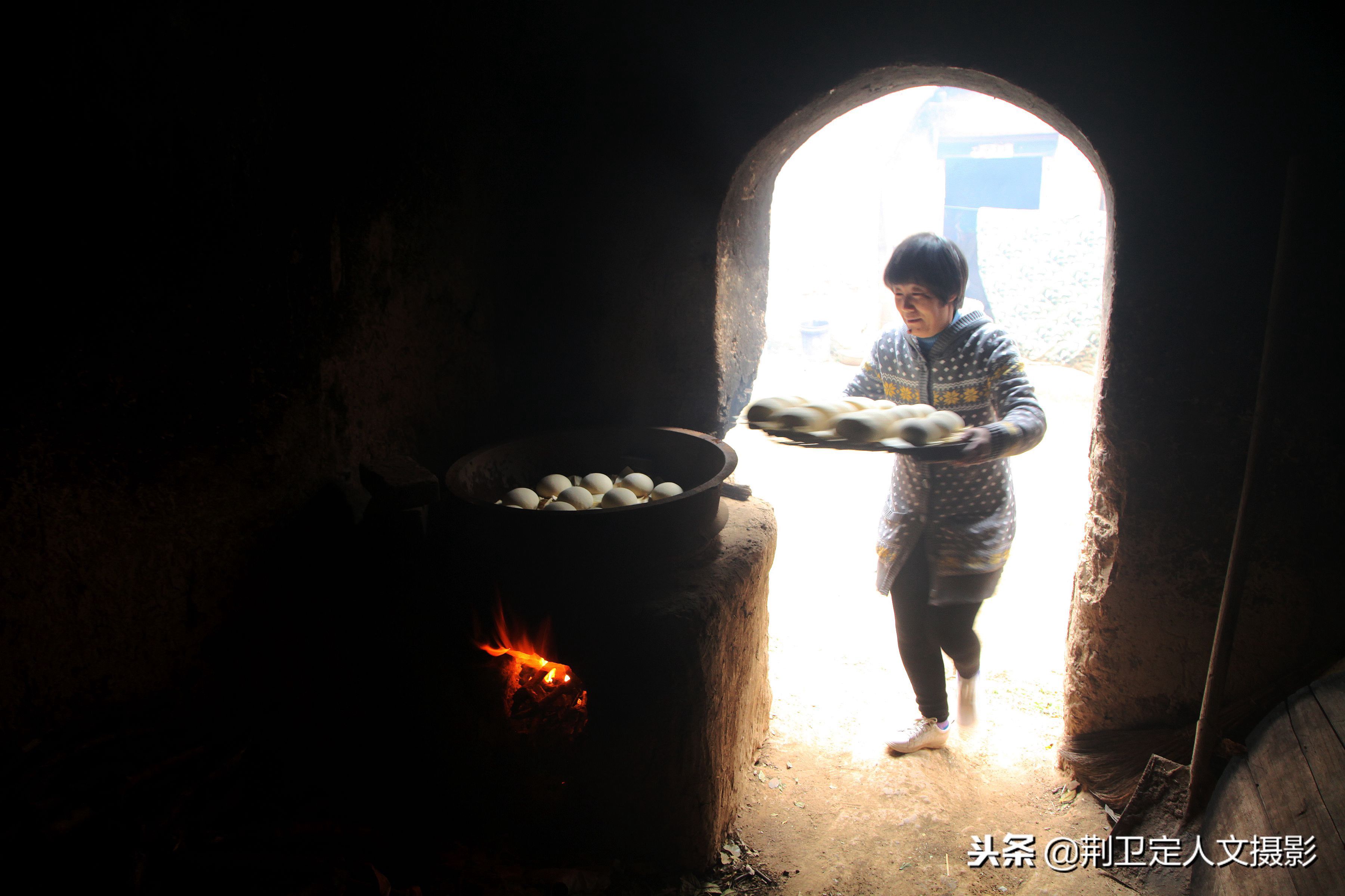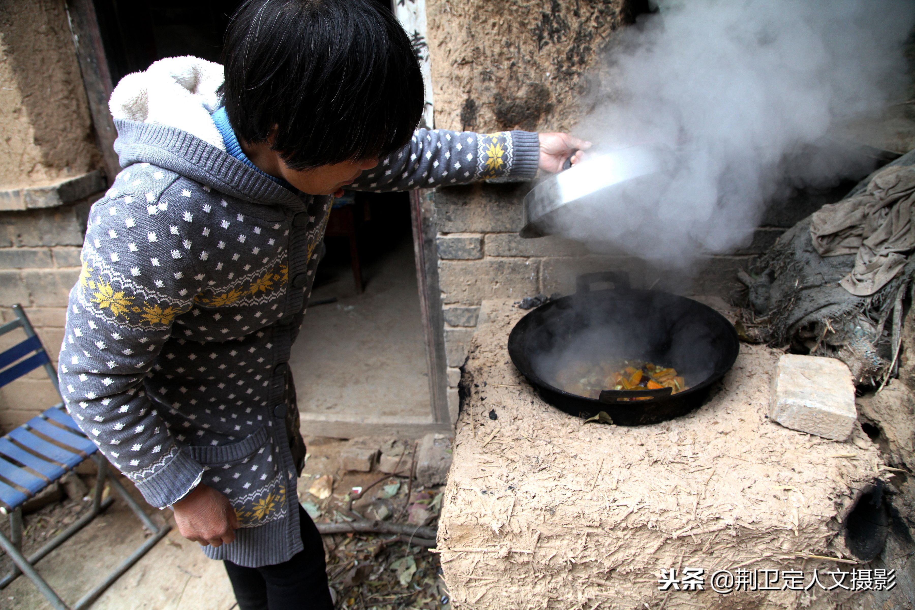 马大妈说由于一周只能回来一次,老父亲年纪大了不能蒸馍做饭了,所以每个周末自己都要回家给父亲蒸够一周吃的馒头,农村人现在做饭使用的还是柴火,现在气温低了,馒头发酵慢,马大妈说要蒸好一锅馒头大约需要2个小时的时间。图为马大妈把馒头放进蒸锅后从地坑上边搀扶下父亲回到家里。